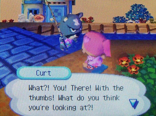 Curt wearing Twisk’s petal dress. 😆 Seeing Peewee and Curt wearing my dress design reminds me of Roscoe in my original AC:WW town. I displayed this frilly blue dress at the Able Sisters and he started wearing it all the time. His hobby was gardening, so he was always walking around in my blue v-neck dress and carrying a watering can. 😛 One of his other hobbies was clothes collecting, which I remember well because he always wanted an amethyst shirt, and I didn’t have one. 👿 He wore pretty much all of my designs, not just the frilly blue dress, though he seemed to like the feminine ones best. 😛