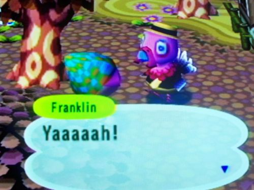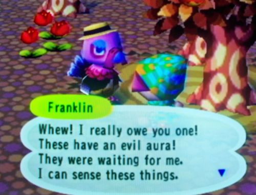 But I hadn’t played for several days, so first I ran around town pulling weeds, and all of a sudden Franklin cried out when I was running by a tree — I didn’t even see him! Way to blow your cover, Franklin. -_-