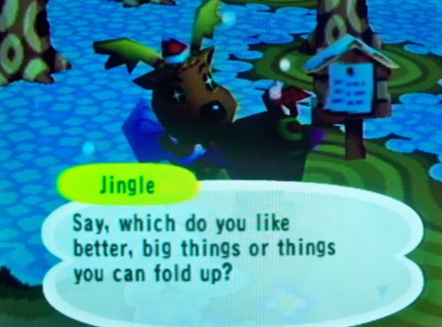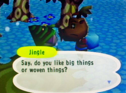 He asks three questions before finally giving a present, and what he gives depends on the answers you give. Big things=Jingle furniture, Foldable things=Jingle shirt, Woven things=Jingle carpet, Printed things=Jingle wall. I picked big things since the Jingle shirt wasn’t as important to me as completing the series.