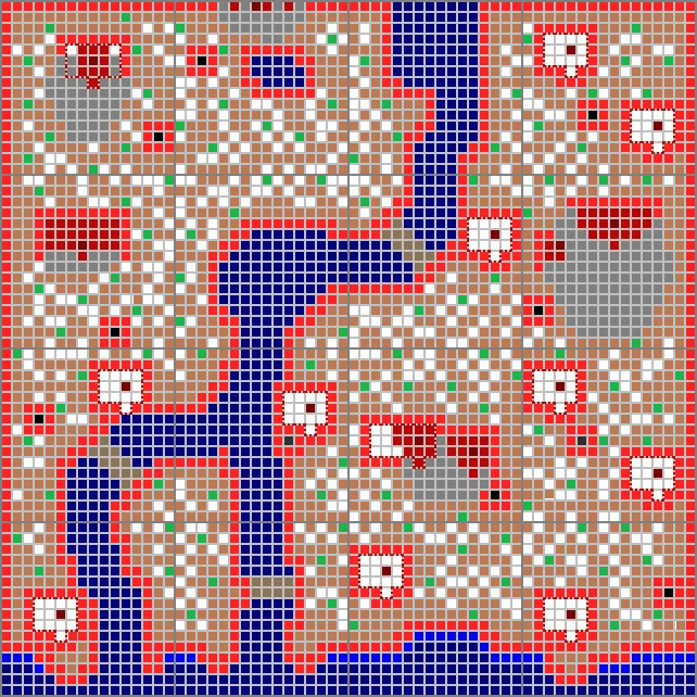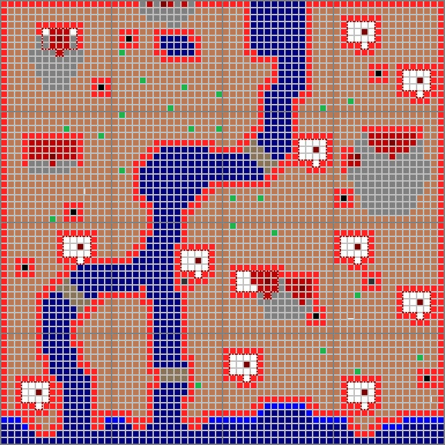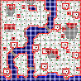 First I marked spots red that seemed unlikely locations for trees to grow and impractical places to have trees anyway. Then I marked green spots where I would plant trees for each day to test for dead spots. The green spots for one day turn to brown the next; once I finish the dead spot testing for each day I mark the found dead spots red and leave the spots brown where trees grow. But there aren’t any dead spots recorded in the following maps because of a problem I ran into with the gridded map I was using to plan my trees (more on that later).