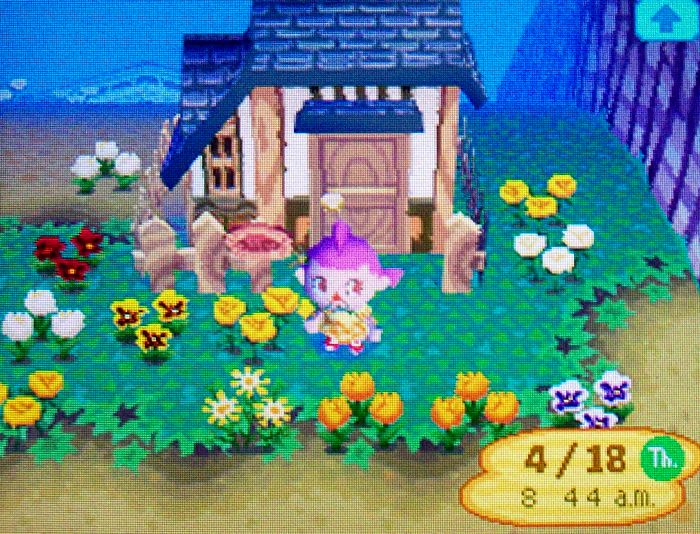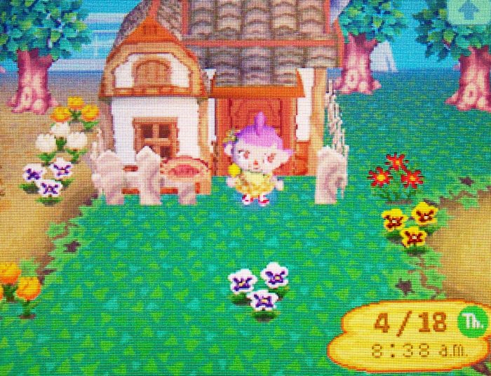 I’m trying to grow hybrids in Imladris in the most natural way possible. I haven’t time-travelled at all because I have Imladris’s gamecard in my 3DS, which is always set to the correct time. I also haven’t used any help from Dafdilly; the watering can and common flowers are all from Imladris.
