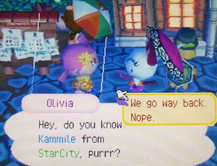 Through DS-to-DSing between Dafdilly and Imladris, the 13th Zodiac has come to Imladris! I love this constellation, which is originally by Teru. Choco also liked it, so a while back she created this constellation as well in her AC:WW town StarCity, and I got it from her through WiFi. It’s nice to see StarCity recalled in the game’s dialogue even though the town has long been gone.