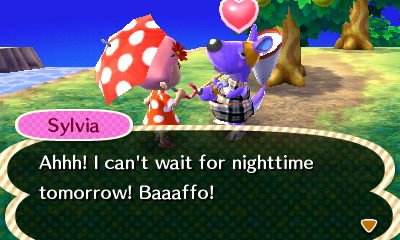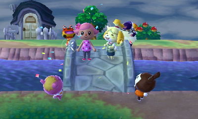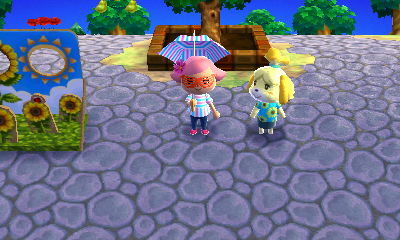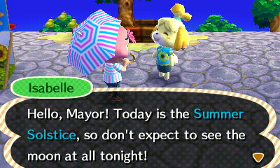 I’ve been pretty unproductive in New Leaf the past few days: haven’t paid off any loans, built any community projects in town, laid down any paths, re-arranged my gardens or trees, or done any WiFi. I thought that once I had a gridded map of my town, I’d get to improving my town right away, but I’ve been a bit lazy about it, I guess. 😛 Oh well, it’ll happen eventually! And there are still a few things to share, like the Summer Solstice on day 12 in my town — the first sort of mini-event so far. 🌞