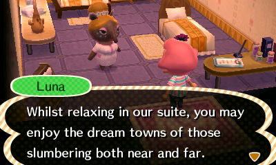The Dream Suite opened today! 😀 I was eager to try it out and explore some towns, but was disappointed that whenever I tried to have her assign me a random dream town to visit, it said that my connection was too unstable. I thought that I’d wasted bells on something that wouldn’t even work for me! >_< But it did work when I actually entered a specific dream code to visit.