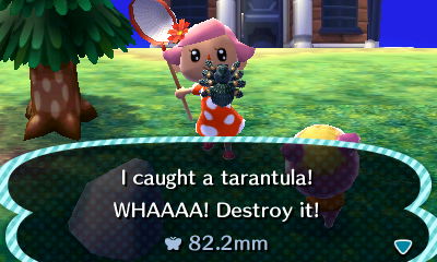 I caught a tarantula too! I can’t catch it on anything but New Leaf. Now it sits in my museum creeping my out. I hate spiders.