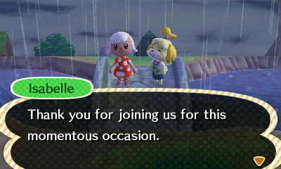 Sometimes I forget that I’m the mayor in New Leaf and just play as I would in any other Animal Crossing game, so I actually forget to go inside the town hall sometimes because there’s not as much to do there. (In AC:WW, it seemed like I was in it much more because it was where you deposited money, paid off loans, mailed letters, etc.) Because of this, I often forget to initiate the ceremony with Isabelle until I randomly remember in the middle of the night (you know how you’re lying in bed and randomly remember things?), and by then it’s too late for my neighbors to attend, I guess. 😛