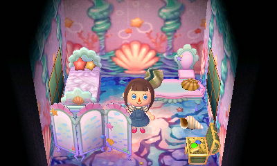 My mermaid room so far… I’ve been able to get some things from my dad’s island recently, like the mermaid floor, mermaid bed, and treasure chest. It’s in Violet’s upstairs room, and I like that you can hear the ocean inside her house. 🙂