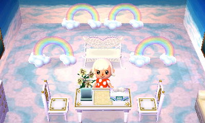 I was able to get a matching cloud flooring and sky wall from my neighbors (being more social with them does help in adding more stuff to your catalog), so I thought I’d use the pair in Estel’s main room and re-do the furniture. I don’t have enough white furniture to do this room properly (I had a room like this in AC:WW), but I at least prefer it to the mismatched assortment of items I had before.