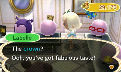 I was tempted by this crown — it’d be fun to maybe play up a fairy-tale princess look with one of my characters — but I don’t have a million bells, and I didn’t feel like beetle-hunting. Maybe it’ll show up another time, hopefully when I have more money.