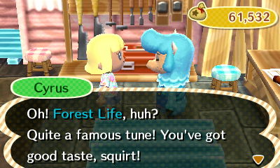 I got two Forest Lifes from K.K., one for a music player and one for a music box, which you can get by taking a giant clam shell, a music album, and 3000 bells to Cyrus. (Though I think it was unnecessary to get two Forest Lifes from K.K. himself because I’ve noticed that songs can be ordered through the catalog now.) I also made a music box out of Stale Cupcakes; it sounded pretty when I visited the deer Diana’s house in Ordona. 🙂 I’ll probably rely on music boxes a lot for now because I don’t have many music players I like.