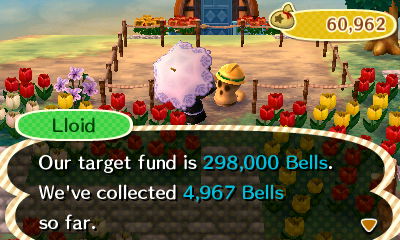 I’ve been trying to get one project a day by doing what’s called “the diving trick.” I swim some laps around the ocean for a little while, to waste time out of sight. Then I sneak around town looking for the right neighbor to walk in front of to trigger the “!” ding. I make sure to fill my inventory with things like money bags, tools, shells, and flowers beforehand so that they won’t try to sell something to me or buy something off of me, hopefully increasing the chances that they’ll request a community project instead. Sometimes it takes a few tries to get a request, which can be a bit boring, so I often do this while reading, watching, listening, or doing something else.
