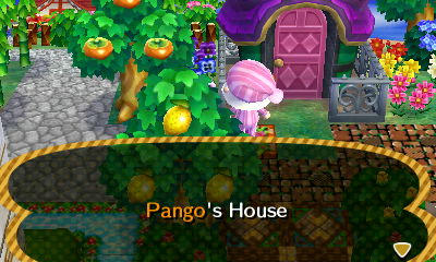 Pango’s house also has the pink fairy-tale door, but with a cool-color scheme that matches Pango’s own coloration. It has the elegant fence I like, too! (This picture was taken in a dream town, one I’ve mentioned before called Kinmokusei.)