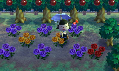 In this game, hybrid red roses x hybrid red roses can produce blue roses. You can get the hybrid red roses by breeding purple x orange roses. (Hybrid red roses don’t look any different from regular roses, btw.) I’d love to have lots of blue roses to decorate with eventually, but they’re so hard to grow. I was never able to grow my own in AC:WW. T_T