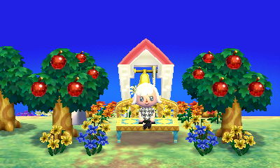 I was planning on building a statue fountain behind this fairy-tale bench, but then decided to try out the bell instead. I didn’t realize how big it would be! 😛 I’m experimenting on how to landscape this area in front of the town hall. I feel pretty limited because of an inconveniently placed rock (you can see it behind the apple tree on the left), and resetting my town has even crossed my mind because of it. I’d just love to have an elaborate garden with community projects in front of the town hall, but this rock gets in the way of pretty much every. single. plan. 😦 But I guess I’ll try to make it work somehow; resetting for a town better than this one, and having to start all over, is a dizzying thought.