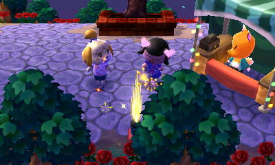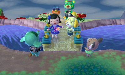 My first fairy-tale bridge! 😀 I actually had to go two extra days without my town’s most essential bridge because I demolished the cobblestone one and tried to build the fairy-tale bridge on the day of the fireworks festival, thinking that the town hall would be open since the fireworks didn’t start until 7 PM, but it wasn’t. The day after, Isabelle said that a fairy-tale streetlight was in the way, so I had to wait another day to demolish that. >_< Be careful when demolishing-and-rebuilding bridges, the requirements for building bridges seem especially picky.