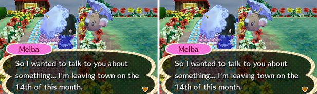Phew, good thing Melba listened to you! It feels like you’ve barely had her. I try to only get noticed by the villagers I want to move out during the days after the newest neighbour has unpacked, but I still get spotted a lot by accident xP