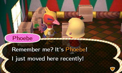 Oh, it isn’t a big deal, she wasn’t his favorite neighbor or anything. He was just a little disappointed, though she sent her picture attached to her goodbye letter, so that made it better. 🙂 And I don’t think it’s realistic for him to ever get Phoebe back because he’d have to cycle through 16 different neighbors before the game would allow Phoebe to move in again, and he never purposefully lets anyone move out. It’s very possible he might never cycle through 16 villagers xP So yeah, I’ll let you know if she packs up! 🙂