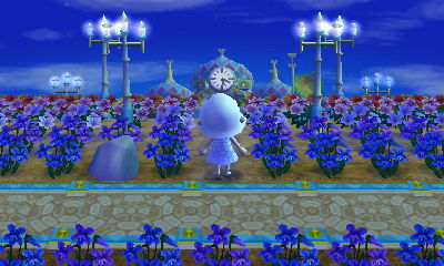 This is kind of random, but recently I realized that I can relate a lot to this post of Teru’s about having a hard time resisting taking pictures of the town tree at different times of day/year, only for me, it’s my town hall area that I’m always taking pictures of! I don’t know why, I mean it’s relatively simple landscaping — just a color fade of lilies and violets and some streetlights — but I just love the way it seems to completely change at different times of day. At night, the cool colors in the lilies/violets field stand out, and everything looks so icy and glimmering (bet that part will look even better when snow covers the ground). In the daytime and at sunset, the warm colors in the lilies/violets field stand out more, looking vibrant and fiery. So I think my flower field in front of the town hall suits my moon&sun concept really well, in an odd, abstract way!