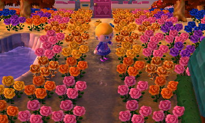 I tried out roses instead of lilies and violets around my fountain (with the same color pattern as before), but strangely didn’t like it as much! So I changed it back to the lilies and violets.