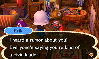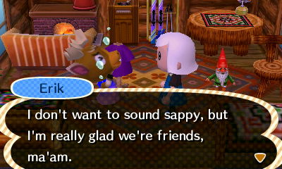 By the way, I read somewhere that the last villager to move in won’t ask to move out until another villager moves in, so there’s that? I’m not too sure if that’s true, but it might be why Erik hasn’t asked to leave your town yet…