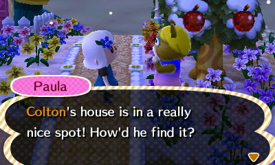 Btw this might be one of the last times I convince Melba to stay, because I’ll be letting her go eventually. 😦 It’s nothing to do with her, but it’s because of her house, which isn’t aligned with the other houses nearby and doesn’t match my house exterior theme that I’m doing (houses with fairytale doors). I’m determined to have Erik move out first, though, and having Melba be the last villager to ever leave.