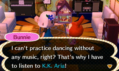 I visited Bunnie’s house when she invited me over, and I think it’s pretty cute! I guess it’s nothing amazing, but I really like the homely touches. And I think it’s neat that every version of her room throughout the AC series has a piano in it — it’s cool to think that playing the piano is a hobby of hers or something. ^^