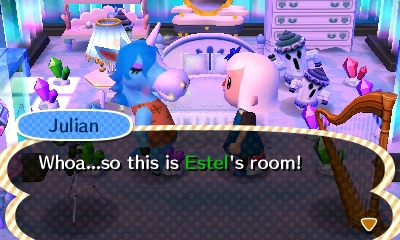 I agree with Marina about the princess bed. It’s really pretty, but I think the blue regal bed fit with the room better. The princess bed is very fancy so it draws your attention away from the rest of the room (which is beautiful). I had the same problem when I put my princess bed in with my gothic white rococo furniture. Maybe your could put a few more princess pieces in there so it’s more distributed throughout the room or put the bed in the upper left corner? The cupid bench would look pretty in there as well or maybe for a bit more color splash you could put a rainbow screen on either side? Just throwing out some ideas though 🙂 I’m always envious of how good your rooms look 😉 We should wifi sometime soon! Citaluna has come a long way (I finally got my statue fountains, but am still waiting on the metal benches to put in the garden). Oh and I think I am going to go with Hazel like you said 🙂 Her house is more colorful and I think Luna would like a squirrel in her town way more than a goat 😛
