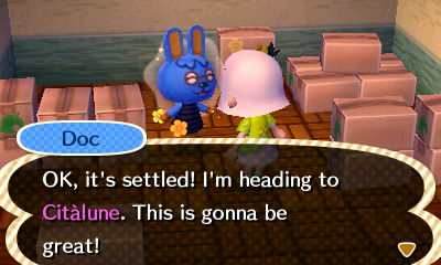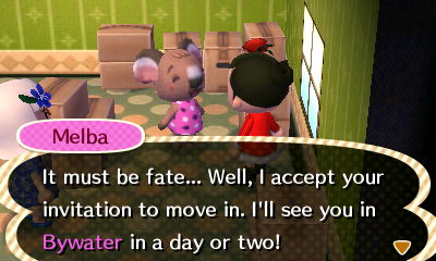 Always a bit sad seeing this message 😦 I couldn’t help remembering some of my memories with Melba in Citàlune, who’s been here since my town was very undeveloped, and has seen it grow considerably and pass through various seasons…I remember she even requested quite a few of the PWPs I wanted, like the fairytale clock and whatnot. But ironically, to complete my town to my fullest satisfaction, I need her to move out now, since her house exterior and house location don’t match the others in my residential area. Well, I enjoyed your time in Citàlune, Melba, and I hope you enjoy your new life in Bywater 🙂