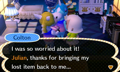 Hahaha oh my goodness! xP Besides that being an interesting series of seemingly connected dialogs, I think I have additional meaning i can add to it! 😛 The reason why he was giving all that fruit is because I sent fruit to him in letters over and over when he lived in my town, attempting to boost my friendship with him so that he would move quicker. When they receive gifts like that that they can’t put in their house, they tend to have it saved in a sort of inventory, and then they’ll randomly give you stuff in their inventory during trades, gifts for errands, etc. So he was giving you fruit from Citalune x3 But it’s also pretty cute that your two deer Deirdre and Erik seem to be forming a connection already! ^^ I’ve mentioned before on my blog that Gloria and Rod continually reference each other over and over, in almost a sort of romantic way. Like Rod’s always giving Gloria presents and musing to me about how he’s going to talk to her or ask her to go on something that sounds like a date to me 😛 But I tend to forget to take pictures when these instances occur, or move past the dialog too quickly.