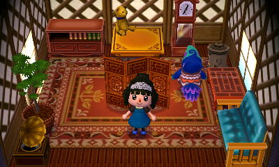 I plan on changing her layout of furniture, though! Eventually I’d like to switch it to a sweets theme, like the series from GracieGrace, and some dessert items scattered around, etc. I’ve been kind of bitter that they took away Melba’s sweets theme in New Leaf, seemingly giving it to Merengue instead. Well, I’m gonna give it back to her xP I’ve started by sending her the birthday table in the mail, that Lenore gave me in our last WiFi. 🙂