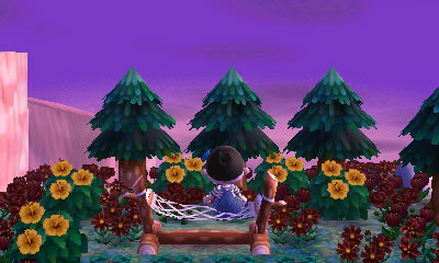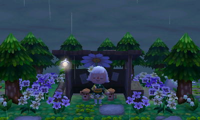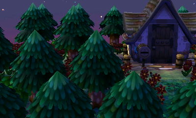 This is a minor little detail, but it’s a detail I really love: how well Bonbon’s house here fits in with the forest atmosphere and how it color-coordinates with the black flowers (which have always looked brown to me in AC:NL). Not only do the petals of the black cosmos match Bon-Bon’s house’s wall, the little yellow centers of the flowers match the roof too 😮