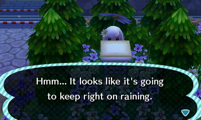 The bus stop PWP provides some shelter for the rain — even for two little gyroids, it seems.