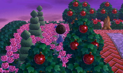 The statue fountain has to be one of my favorite PWPs, I always loove seeing what different people do with it. In this case, the use of it seems pretty simple but I still adore the look of the symmetric trees around it, and the bush-enclosure filled with pink roses 🙂