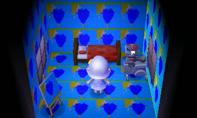 And the interior is decorated with a self-made town flag 🙂 I wonder if she’s a new player of AC:NL, or if she’s had it for a while and lost interest, or if expanding her house just isn’t one of her game priorities. But it’s really exciting for me to have something in my HHA Showcase other than the standard Nintendo SpotPass houses! 😀