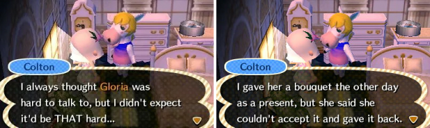Lol, Bunnie, I love how the villagers are so absentminded sometimes, though that could be annoying, too. Heh, once I caught a flea from Bunnie (from my town 😛 ), and she said to not tell anyone, especially not Mint. But Mint was standing right there! 😛