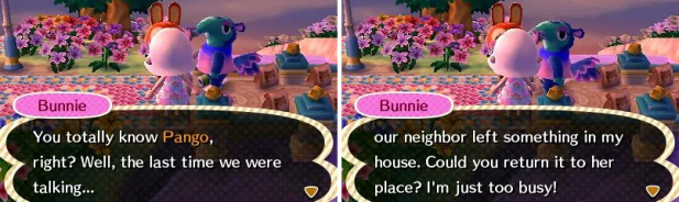 Just hand it right over, Bunnie! And anyway I always refuse errands like this because it can mess up their houses. Once I delivered something to Bruce and he ended up having a horribly clashing lovely lamp in his house for months 😐