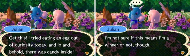 It's funny to hear how your villagers (Julian at least) don't have particularly positive things to say about Zipper T. Something about that guy rubs me the wrong way… And the rocks on Bunny Day freaked me out! I reset several times to try to get rid of them xD