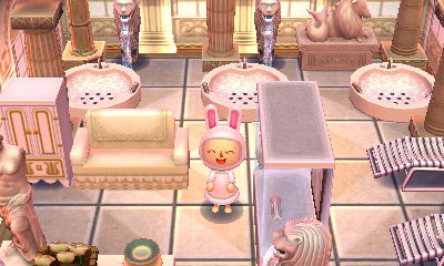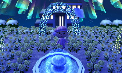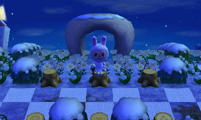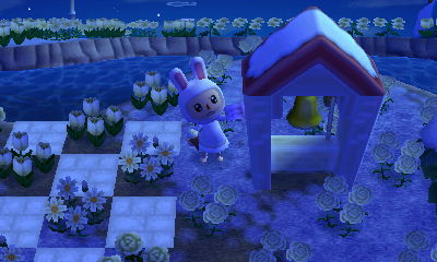 This is a genius town that you might already be familiar with, but I wanted to sing my praises to it as well. Its concept revolves around the color white from top to bottom — the snow, the flowers, the PWPs, the villagers (and therefore, a lot of their houses happen to be lightly-colored as well to match their owners), and the human residents’ homes & interiors. This theme done by someone less inspired might’ve come across boring, but with the creativity and artistry this player used, the result is absolutely striking.