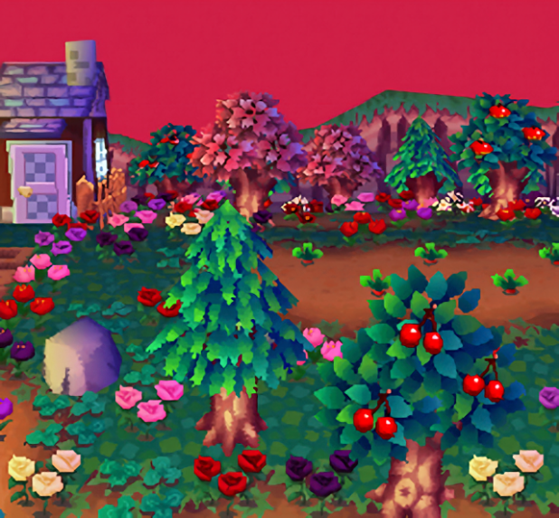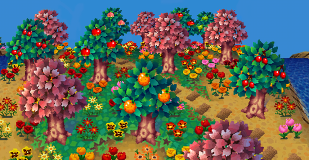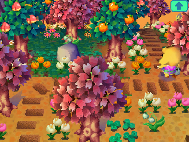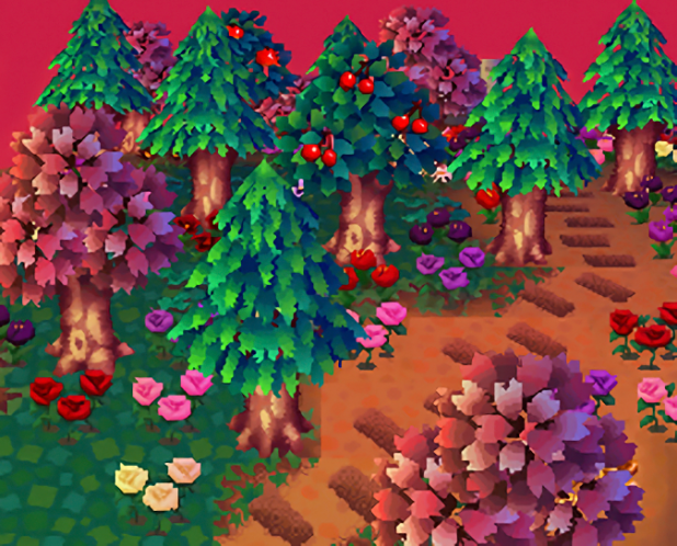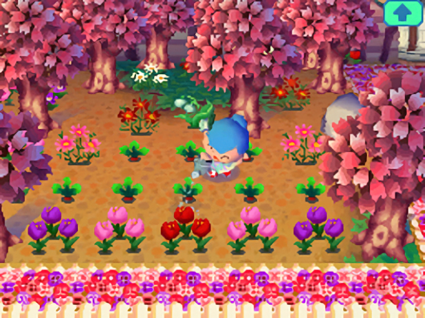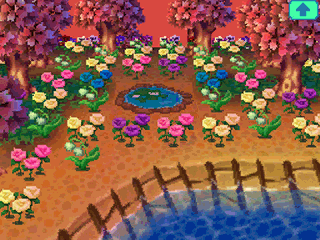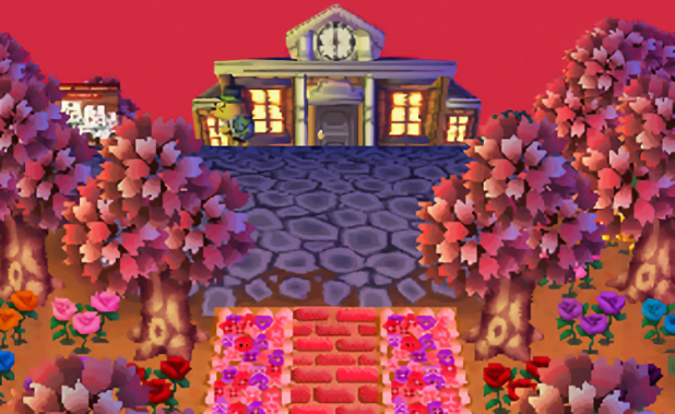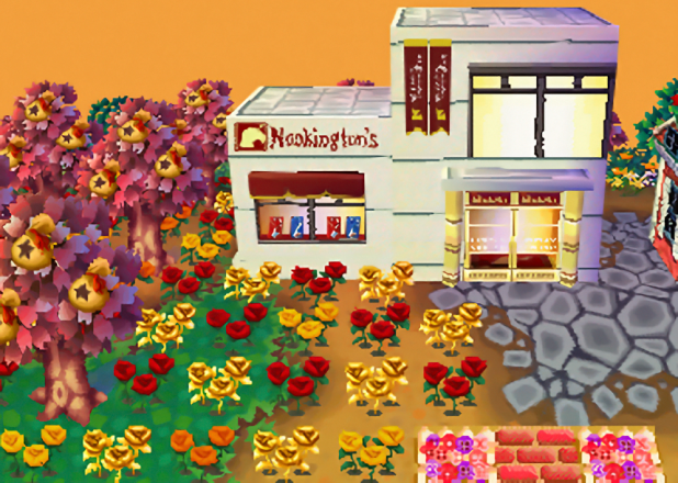 If you remember, the first task Nook has you do as a part-time employee for him at the beginning of the game is plant trees and flowers around his shop, saying, “The shopping experience is greatly enhanced by clean and alluring surroundings! I’m counting on you to give the place a little charm, indeed!” I like to think that Nook would be pleased with how his department store’s grounds have grown more elaborate over time, with bell trees and red and gold flowers. 🙂
