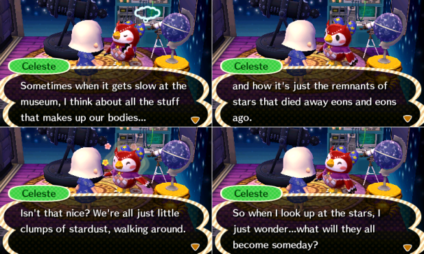 Wow, I can’t say I ever expected to see dialogue like this in Animal Crossing! ❤ I love the study of Astronomy, and this is an idea I've heard a lot about over the years, helped popularized by Carl Sagan. It's a beautiful concept, but humans alone aren't stardust; pretty much all heavier elements than hydrogen & helium were formed in the cores of stars, from what I understand. But it's still something nice to think about if you ever feel insignificant: stars died in gigantic supernovas to spread the elements that eventually made up our bodies, miracles of life~