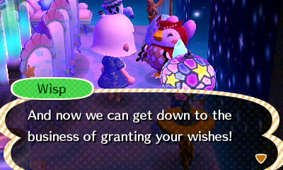 The way he sings town tunes is so pretty, I would love to hear him sing other tunes! Forget granting wishes, just sing for me Wisp xP (Kidding though, I need those meow coupons too :P)