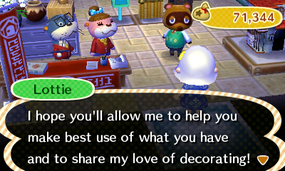 Also high on my priorities, besides scanning amiibo through Wisp, was getting that secret storeroom (which finally got me to pay off the loans I’d been sitting on with all my characters besides Lyra) and passing Lottie’s seminar so I could arrange furniture using the touchscreen room-designing tool from AC:HHD. It was nice seeing Lottie make an appearance in New Leaf ^^
