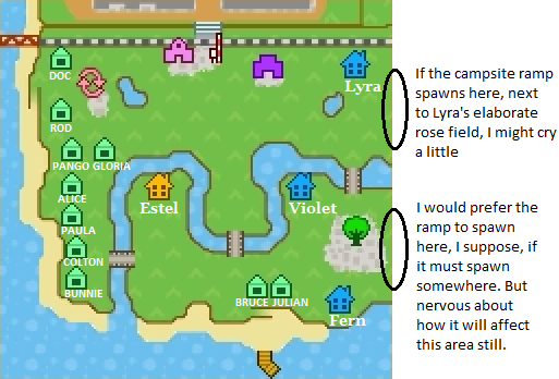 As I drew up here before downloading the update, I was really hoping the ramp would spawn by the town tree, or anywhere on that side of the river, and I started to get hopeful when I saw that some other players had their ramp spawned by their town tree. The rustic look of the ramp wouldn’t have looked so out of place on this more earthy side of town, and while I was a little nervous about the specifics, I think that I could have grown to love the dynamic of having a ramp in the cliff here, making the area seem more open instead of closed off. And I think I could have actually worked it into the landscape possibly, with some moon tiles leading up to the ramp perhaps. So part of my disappointment wasn’t just about where my ramp spawned, but also about where it could have been if not for unlucky chance.