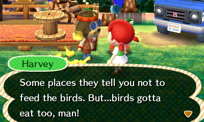 I forgot to introduce myself to Harvey before heading for the goods. xD Heck, it felt like I already met him with that Animal Crossing Direct… I do really enjoy him as a new NPC; he’s perfect for the campground, has a lot of personality, and I love how you can walk in on him doing lots of different activities: feeding the birds, playing an instrument, reading, or drinking a cup o’joe.