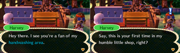 Fern got some throwing beans from Harvey. Though I’d already gotten one from a trade earlier, it’s great that this item isn’t a regional exclusive anymore! It looks like New Leaf is heading in that direction slightly, with some of the regional food items now being available through RVs, and some of the sloppy furniture from Wendell’s, etc.