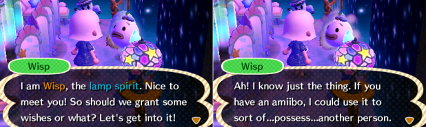 It’s not quite as creepy as it sounds…rather than truly possessing, Wisp just makes himself look like the amiibo you’re summoning, it’s like taking a Polyjuice Potion in Harry Potter. 😛 Then he grants a wish relating to that amiibo, like summoning them to the campsite (not for series 1-400 amiibo cards though), giving a piece of furniture, or even moving them in (if it’s not a main NPC).