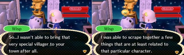 I love Wisp’s jingle! Every time I visit him I turn the volume right up first. His lamp goes really nicely in Estel’s bedroom (as does Celeste!). I visited your dream address recently and noticed the new town tune! It was nice ^^ I didn’t recognise it though; was it your own creation? Haha, it’s funny how Wisp is unable to bring in the Villager xD But it’s cool that you can get those special items, including a lifesize gold statue! :O