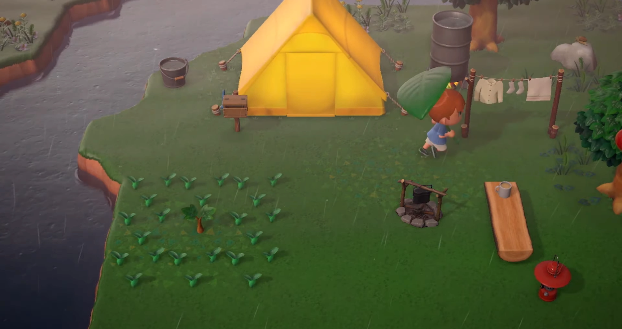Rain:Tent in RainRainy sceneryI love how the slightly golden tinges of late afternoon are maintained, even though it’s raining. (In AC:NL, I felt the atmosphere became generically gloomy and gray when it rained, no matter what time of day it was.) Also, the rain drops don’t just plop with a little splash in the water; they create detailed ripples this time, too. ;_;