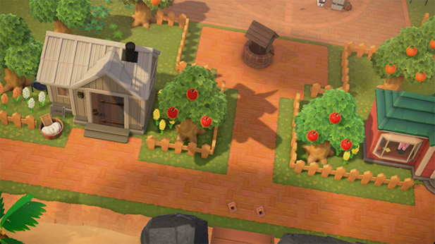 The neighborhood lined up against the shore is gorgeous as well! I love how it’s both developed in an Animal Crossing sense, in that there’s lots of landscaping done, but it still comes across so rustic and natural, like this is just the way things have always been in town. Also, each villager has their own little fenced in backyard area!
