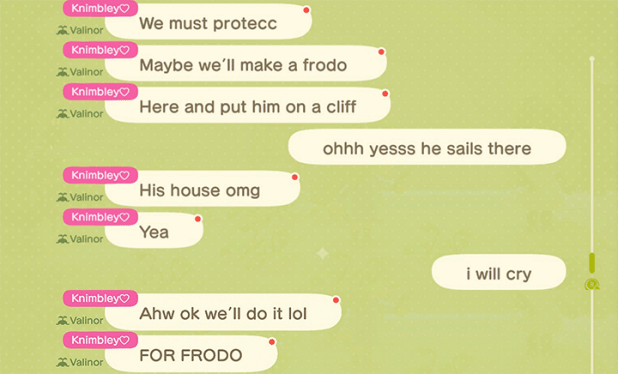 Knimbley messaged me a screenshot of scanning in one of my ACNL QR codes into New Horizons, one of the first examples of me seeing that happen… and we got to talking and she invited me to her town Valinor! I was instantly intrigued as a Lord of the Rings fan, getting the reference to the land across the sea in Middle Earth (a sort of heaven allegory where the Valar/gods live).